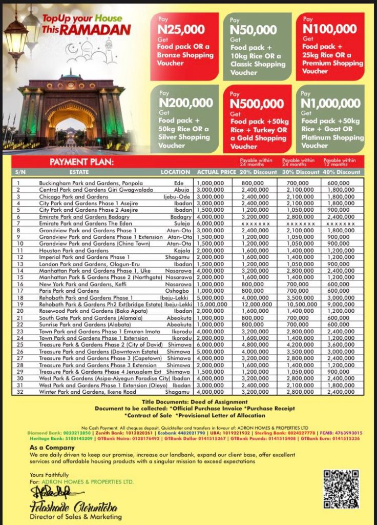 Top up your House this Ramadan and let’s build your own Dubai in any of your desired Estate. You also get to enjoy 40% to 20% Discount payable within 24 Months with as little as ₦25,000 on all our estates nationwide.