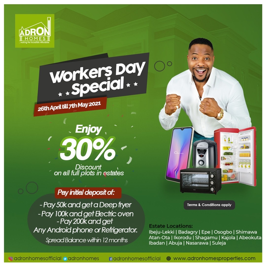 The workers day special promo comes with an exclusive discount offer affordable to all irrespective of your monthly income and a flexible means of payment which can be payable within 24 months or more. How cool is that?