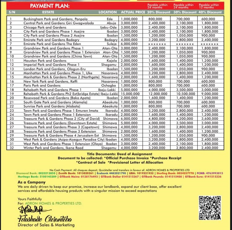 Below is a price list of our estates, for assistance in getting the perfect estate that suits you; please chat with Adron Homes Customer Service by clicking on the whatsapp icon.